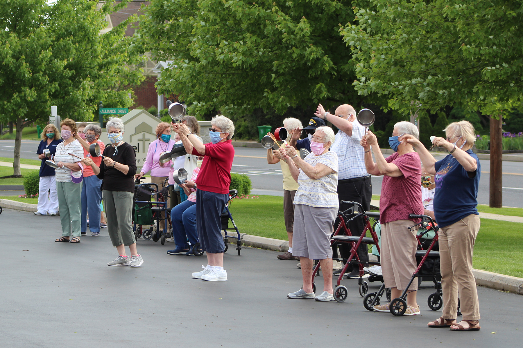 Armed with pots and pans, the independent living residents of Chapel Pointe lined the campus Friday morning and made a joyful ruckus, drawing staff out to the porches. Signs of thanks speckled the crowd and shouts of praise rang out among the clanging of pots.